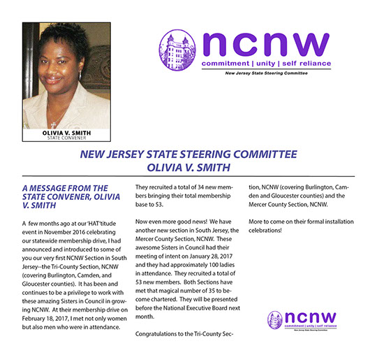 I am honored to welcome you to the State of New Jersey - NCNW Web Portal. A first in New Jersey the NCNW Portal is a place where you can find out what is happening around the State for each of our sections. This portal has information on statewide membership drives and leadership conferences that will help grow your sections. Through participation in these events, you will gain valuable knowledge and information to not only grow your sections but also manage it successful.