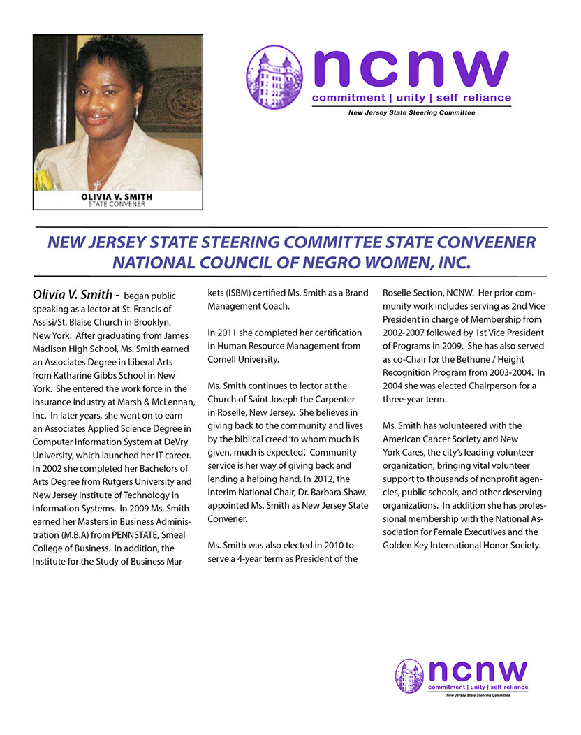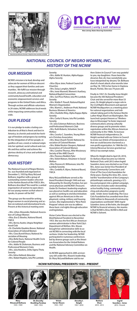 Most importantly, you will have access to 12 thriving sections, the New Jersey Life Members Guild and the growing collegiate sections. You will learn the history of each section, their commitment to the National Council of Negro Women, Inc., and the NCNW programs that are implemented within their communities. You will see activities around their fundraising events that sustain and support not only their Sections but also our National Headquarters.
