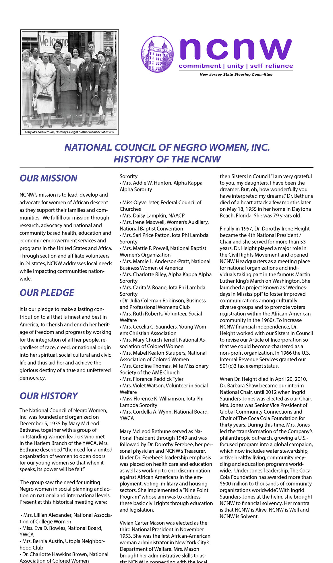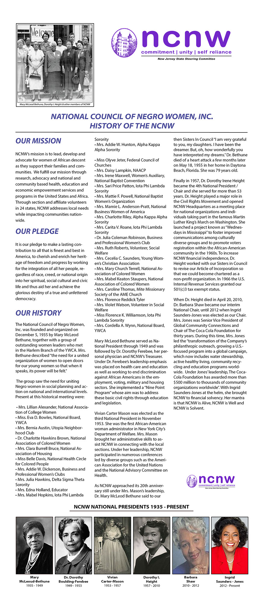 Most importantly, you will have access to 12 thriving sections, the New Jersey Life Members Guild and the growing collegiate sections. You will learn the history of each section, their commitment to the National Council of Negro Women, Inc., and the NCNW programs that are implemented within their communities. You will see activities around their fundraising events that sustain and support not only their Sections but also our National Headquarters.